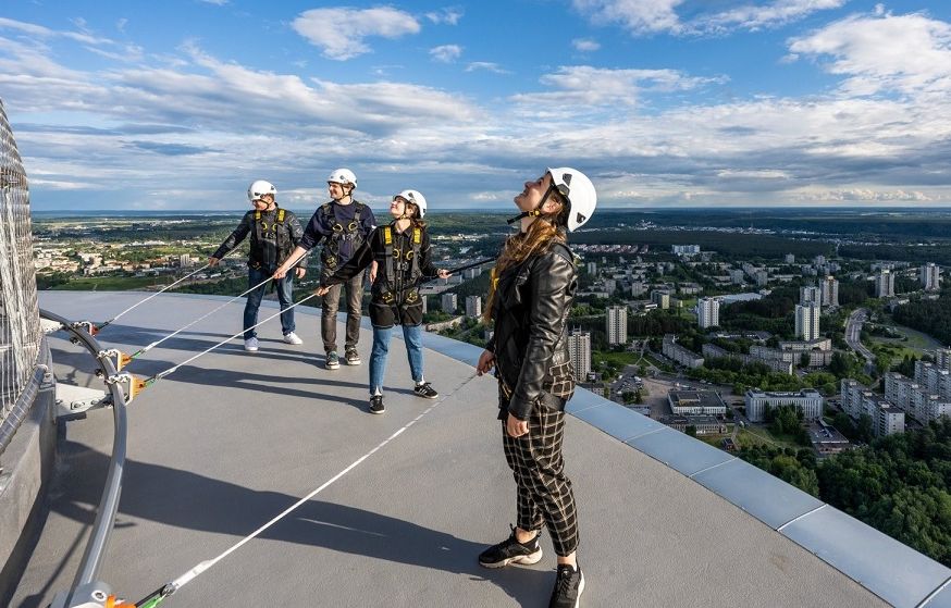 Aukščiausias Lietuvos statinys – Vilniaus TV bokštas – ekstremalių pojūčių mėgėjams pasiūlė naują pramogą – pasivaikščiojimą apžvalgos terasos pakraščiu 170 m aukštyje.