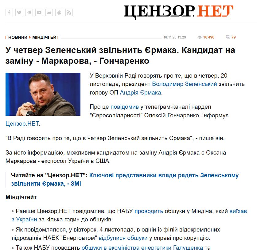 Aukščiausioje Radoje sklinda žinia, kad ketvirtadienį, lapkričio 20 d., Ukrainos prezidentas Volodymyras Zelenskis atleis Andrijų Jermaką iš Prezidento kanceliarijos vadovo pareigų ir į šias pareigas paskirs buvusią ambasadorę Jungtinėse Valstijose Oksaną Markarovą.