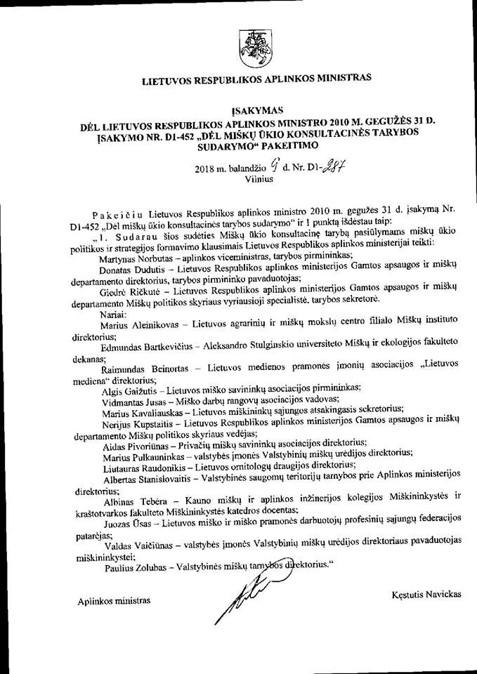 Dabartinis aplinkos ministras Kęstutis Navickas apsistatęs patarėjais, kurie yra arba suinteresuoti verslininkai, arba urėdai ir jiems pavaldūs mokslininkai iš Miško biologijos ir miškininkystės instituto Kauno rajone esančiame Aleksandro Stulginskio universitete. Nešališkų stebėtojų beveik neliko, tik visuomenininkai.