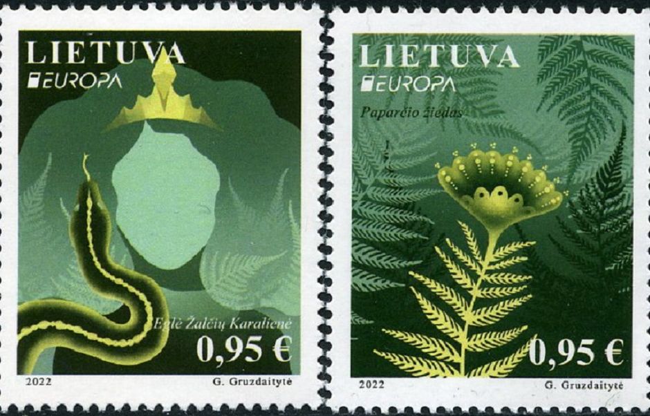Pasak tautosakininkų, tai viena iš nedaugelio lietuviškų pasakų, kuri baigiasi nelaimingai. Šaltiniuose rašoma, kad pirmą kartą „Eglė žalčių karalienė“ publikuota 1837 m. Nuo to laiko pasaka ne kartą virto dar ne viena knyga ar spektakliu, Palangos botanikos sode iki šiol stovi šiai legendai skirta skulptūra. Kitame pašto ženkle G. Gruzdaitytė atvaizdavo taip pat Lietuvoje simbolinę reikšmę ir visiems puikiai pažįstamą papartį, tiksliau, paparčio žiedą. Nors iš tiesų paparčiai nežydi, nuo seno jo paieška Joninių naktį apipinta ne vienu mitu.